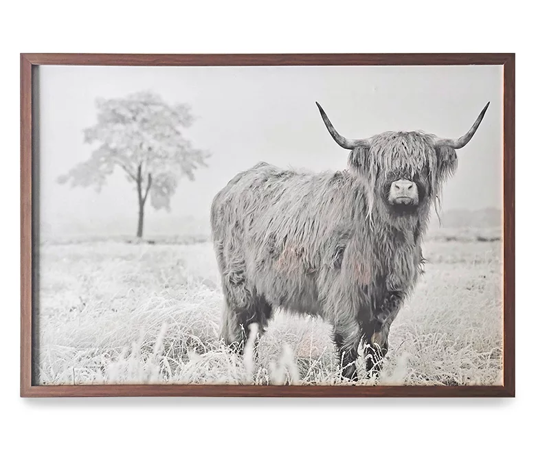 Add some rustic charm to your home with this lovely black and white cow framed glass art. With its beautiful black and white image of a cow and beautiful framed design, this piece of art is the ideal accent to bring a down-to-earth sensibility to your home.