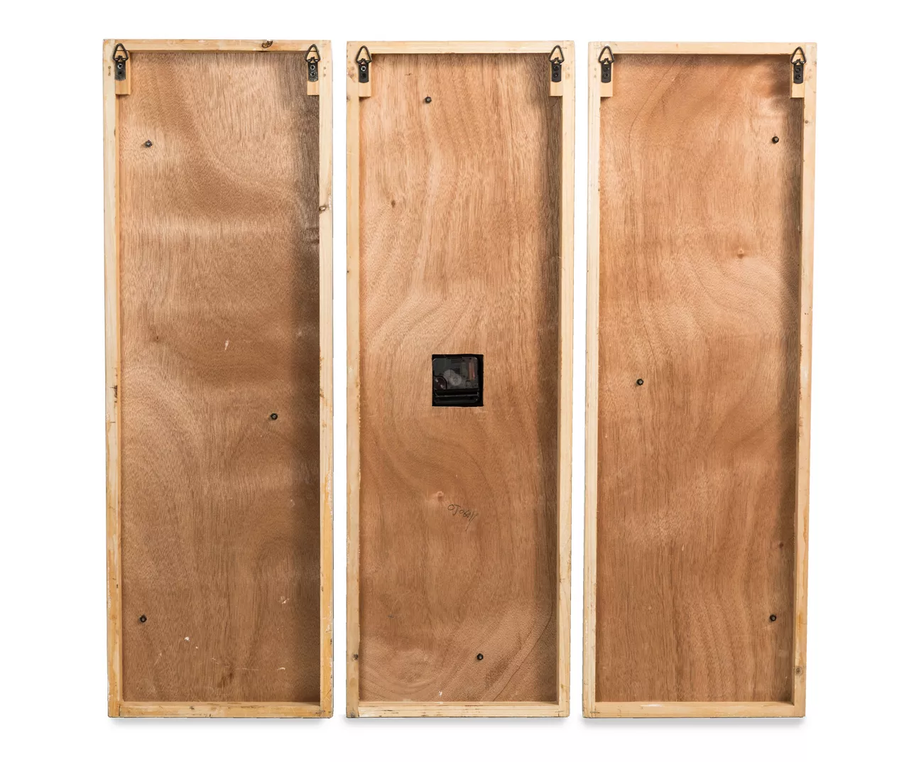 A triptych-style paneled design lets you create unique timekeeping arrangements with this three-piece wall clock set. Wooden pallet-style boards are topped by a minimalist face design and finial clock hands. Hook loops on the back make installation quick and easy.