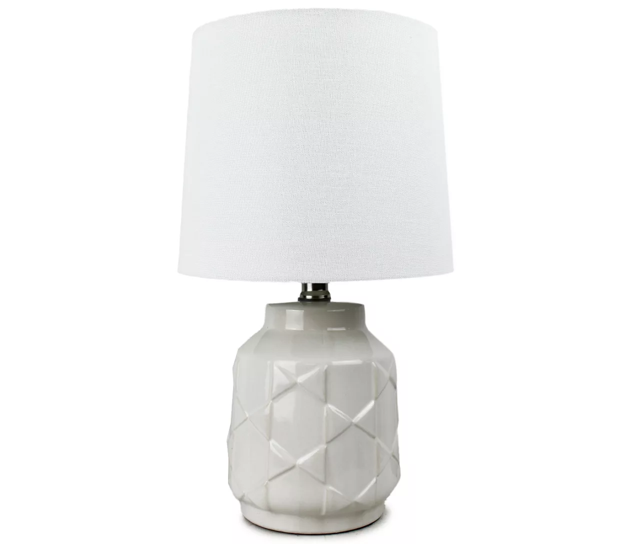 Boasting a modern embossed geometric design in glazed ceramic, this accent lamp from Real Living is sure to stand out in any room while providing warm, diffused light thanks to its white fabric shade.