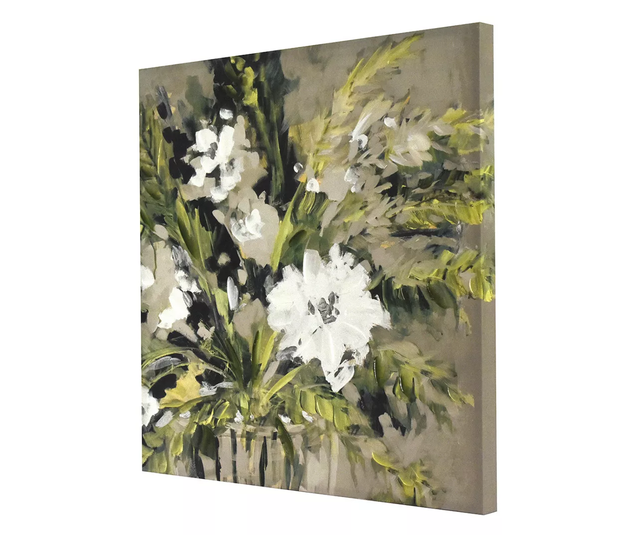 Curate a look for your home displaying this art canvas. A close-up painterly depiction of a flower bouquet is captured in white and multiple shades of green on a contrasting gray background.