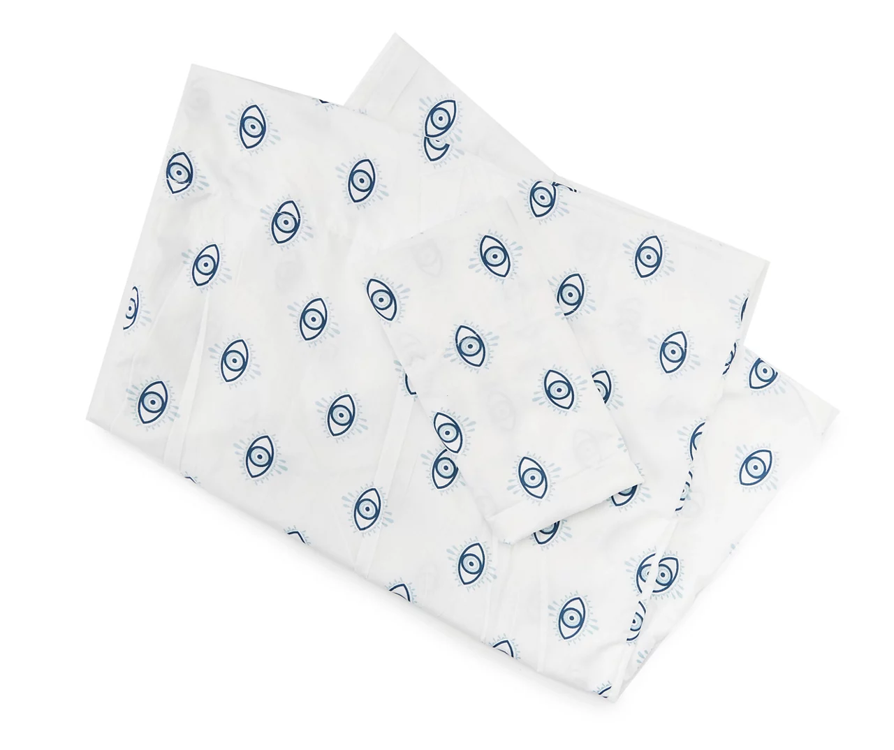 From Real Living’s Grecian Getaway collection, this soft microfiber sheet set keeps you comfy through the night while adding modern boho flair to your sleep space thanks to a white and blue all-seeing eye pattern.